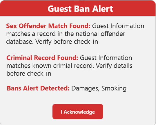 Real‑time nationwide DNR alerts and offender checks help you keep high‑risk guests away.